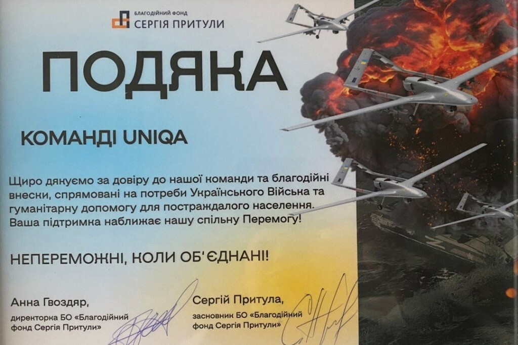 UNIQA Group разом з УНІКА Україна співпрацює з Фондом Сергія Притули в напрямку гуманітарної допомоги. В 2022 році було організовано 5 поставок вантажів з Австрії в Україну з вкрай важливими та необхідними медикаментами, такими як плазмозамінник Volulyte 6%, антибіотики та препарати для індукції анестезії, та засобами тактичної медицини.