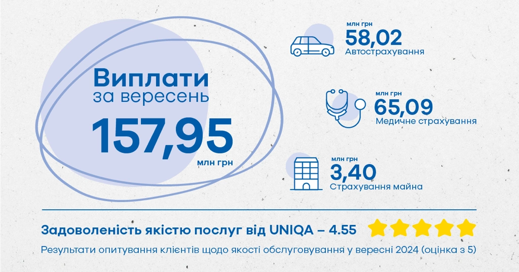 Страхова компанія UNIQA підрахувала, що загальна сума виплат клієнтам у вересні 2024 року склала 157,95 млн грн. Найбільше виплат припало на автострахування, медичне та страхування життя.
