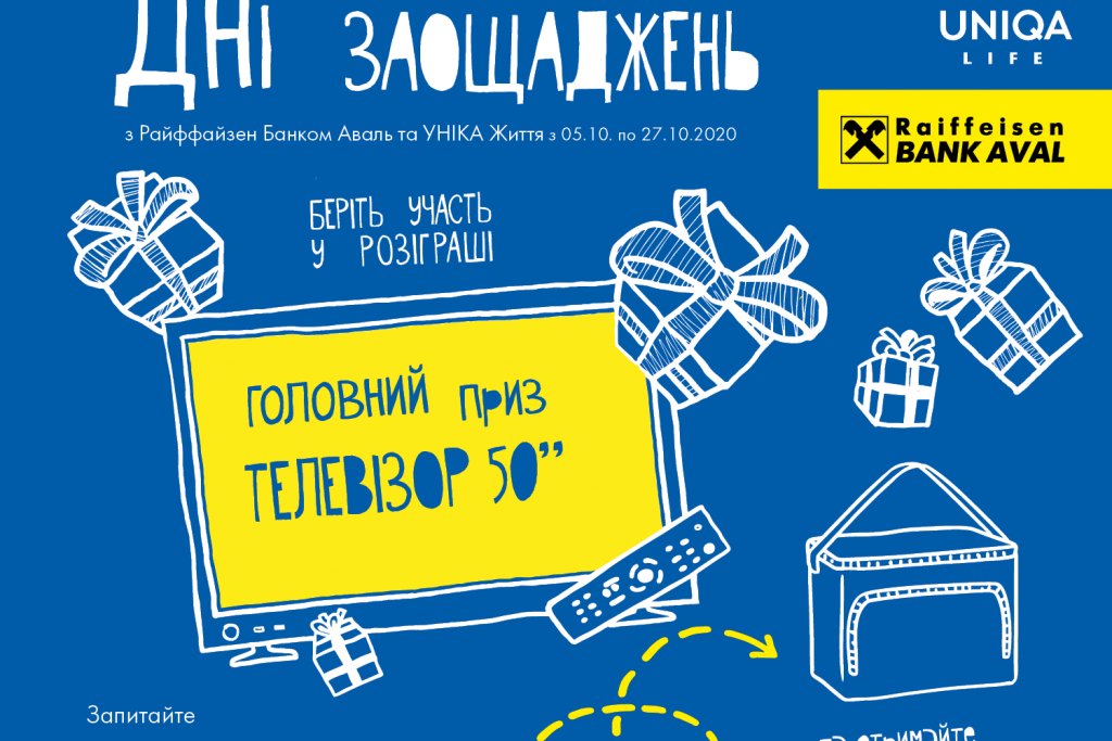 УСЛОВИЯ АКЦИИ:1. Период проведения: 05.10.2020 – 27.10.2020.2. Сеть отделений Райффайзен Банка Аваль - Перечень отделений и график проведения в них Дней сбережений.xlsx3. Под главным призом имеется в виду покупка телевизора Smart TV Samsung UHD-4K 50" за 1 грн.4. Дата розыгрыша: 01.12.2020. Победитель розыгрыша определяется случайной жеребьевкой с помощью онлайн-сервиса https://www.random.org/lists/.5. Процесс проведения розыгрыша записывается на видео с последующей публикацией на соответствующей официальной веб-странице Страховой компании «УНИКА Жизнь».6. Дни сбережений проходят на всей территории Украины (за исключением АР Крым, а также населенных пунктов Донецкой и Луганской областей, на территории которых органы государственной власти временно не осуществляют свои полномочия).#УНИКАЖизнь #UNIQALife #RaifCare