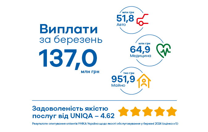 В марте 2024 года клиенты UNIQA Украина получили страховые выплаты на общую сумму 137,07 млн грн.