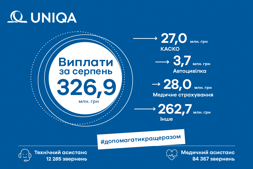 Сумма страховых выплат клиентам небанковской финансовой группы «УНИКА Украина» (страховые компании «УНИКА» и «УНИКА Жизнь»), в августе текущего года составила 326,91 млн. грн.